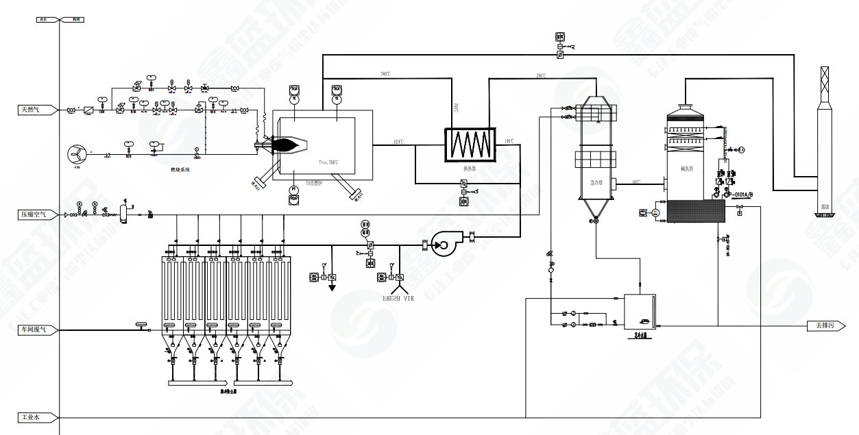 此次项目采用工艺为:布袋除尘器+TO直燃炉+急冷塔+碱洗塔