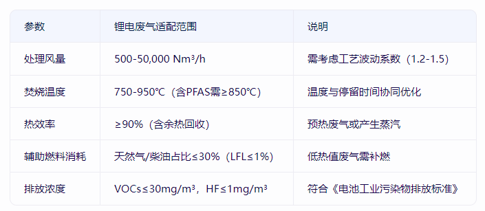 通过燃气/燃油辅助燃烧,将废气加热至750-950℃(根据成分调整),使有机物(如NMP、电解液)分解为CO?和H?O。