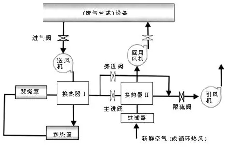 其工作过程为:用一台高压头风机将有机废气从烘干室内抽出,经过废气焚烧集中供热装置的内置换热器预热后,到达燃烧室内,然后再通过燃烧机加热,在高温下(750℃左右)将有机废气进行氧化分解,分解后的有机废气变成CO2和水。产生的高温烟气通过炉内的换热器和主烟气管道排出,排出的烟气对烘干室的循环风进行加热,为烘干室提供所需的热量。在系统末端设置新风换热装置,将系统余热进行最后回收,将烘干室补充的新风用烟气加热后送入烘干室。另外,在主烟气管道上还设置有电动调节阀,用于调节装置出口的烟气温度,最终排放的烟气温度可以控制在160℃左右。