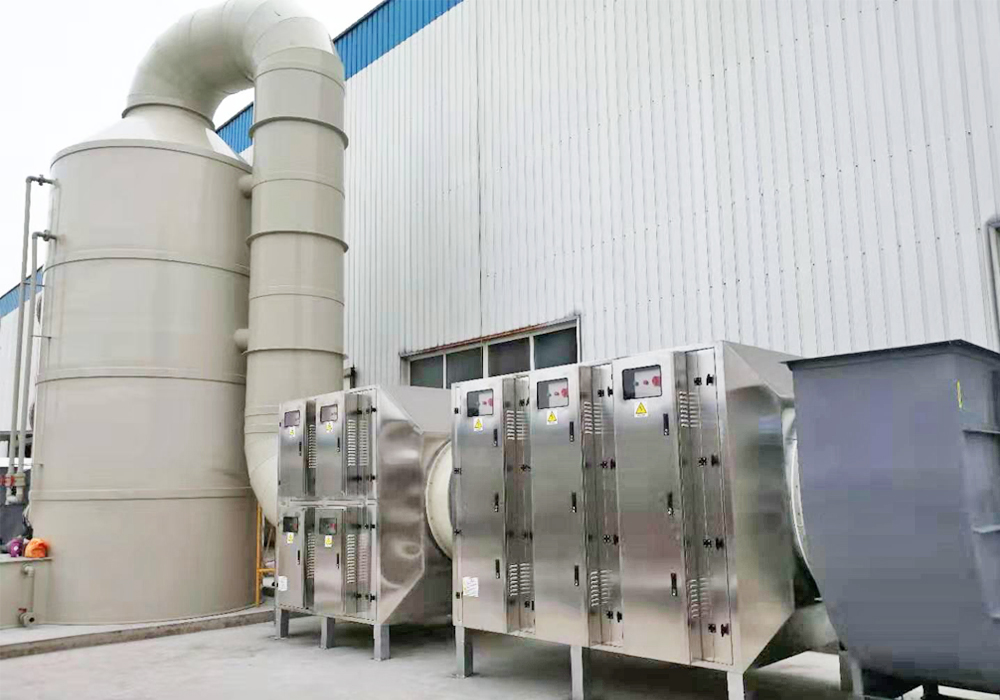工艺流程:废气通过收集总管依次进入沉降室、沉降室内布置喷头及过滤网,在降温的同时,颗粒粉尘聚集成大颗粒,然后通过过滤网进行截留,随后废气再通过热交换器降温至40℃左右,进入两级洗涤塔,废气中的有害成分被吸收、氧化分解,鱼粉加工的时候产生的废气种类比较多,像氨气、硫化氢、二氧化硫、甲硫醇、甲硫醚、笨、苯乙烯、二甲二硫、正已醛等,再一个浓度比较高,所以采用了等离子和光氧化相组合的设备来乐竞入口这些废气。然后在废气洗涤塔的后面加了一台低温等离子设备以及一台光解式废气净化设备再通过引风机、烟囱达标排放。