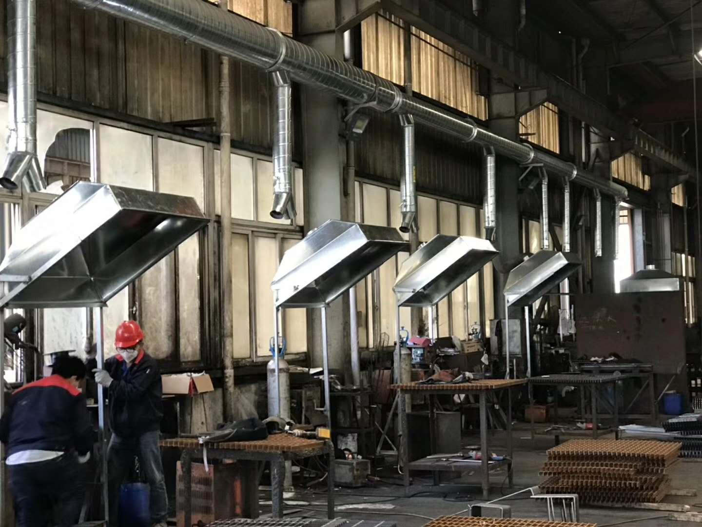 根据客户现场情况及布局,多工位的机器人焊接区,将加工区域的焊接烟尘进行治理即可,为不影响现场机器人操作及零部件的转运,治理方式选用上部吸气罩进行烟尘治理,罩子规格尺寸可根据数据定制制作,为了操作方便及焊接烟尘的捕捉效果,采用固定式顶吸罩的形式进行烟尘捕捉。