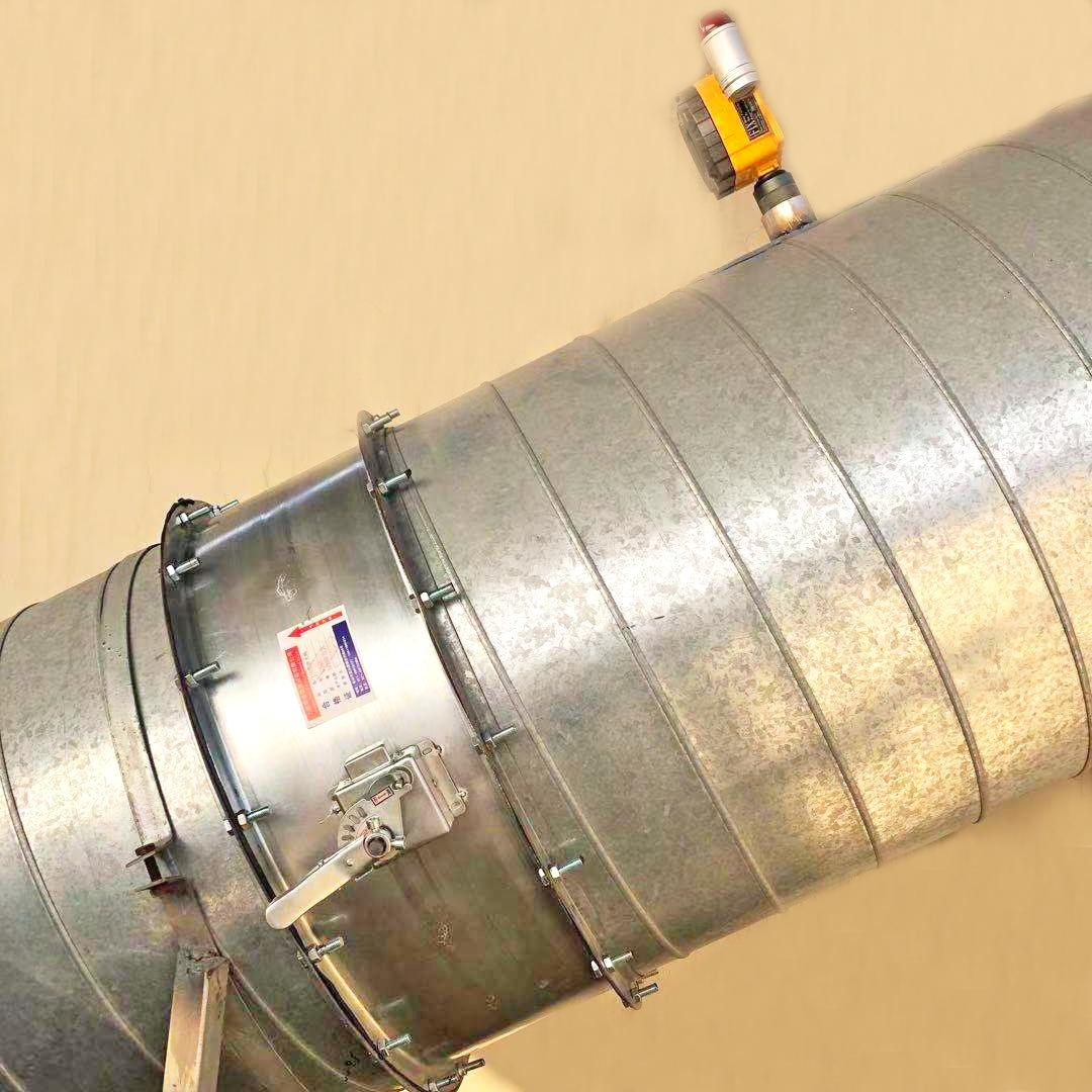 抑爆装置:在风管和(或)除尘器上设置抑爆装置,爆炸发生瞬间,向风管和(或)除尘器内充入用于扑灭火焰的物理、化学灭火介质,抑制爆炸发展或传播。存在有毒性、腐蚀性粉尘,以及燃料粉尘的除尘器及风管不应采用泄爆装置进行泄压,应选用向除尘器及风管充入用于扑灭火焰气体或粉尘介质的抑爆装置。