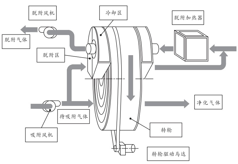 沸石转轮浓缩结构分为乐竞入口区、再生区、冷却区,浓缩转轮在各个区内连续运转。VOC有机废气通过前置过滤器后,通过浓缩转轮装置的乐竞入口区。在乐竞入口区VOCs被吸附剂吸附去除,净化后的空气从浓缩转轮的乐竞入口区间排出。