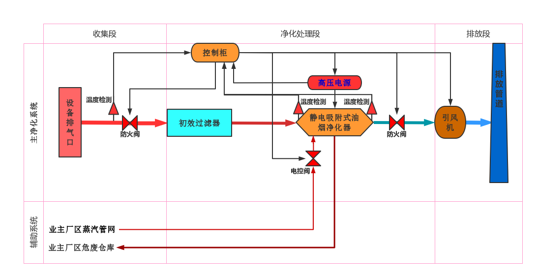 化纤车间作业废气,由设备排气口接入废气收集管道,顺不锈钢管道进入初效过滤器,先经不锈钢丝网初效过滤器滤除废气中的灰尘、纤维类颗粒物后,通过管道接入静电吸附式油烟净化器,经净化器内高压电场作用,油烟中油雾颗粒被电场阳极捕捉,顺阳极滴落在集油盘中,由排油口排出至废油收集桶。经油烟净化器净化后的气体,经引风机送入排放烟囱对空15米达标排放。
