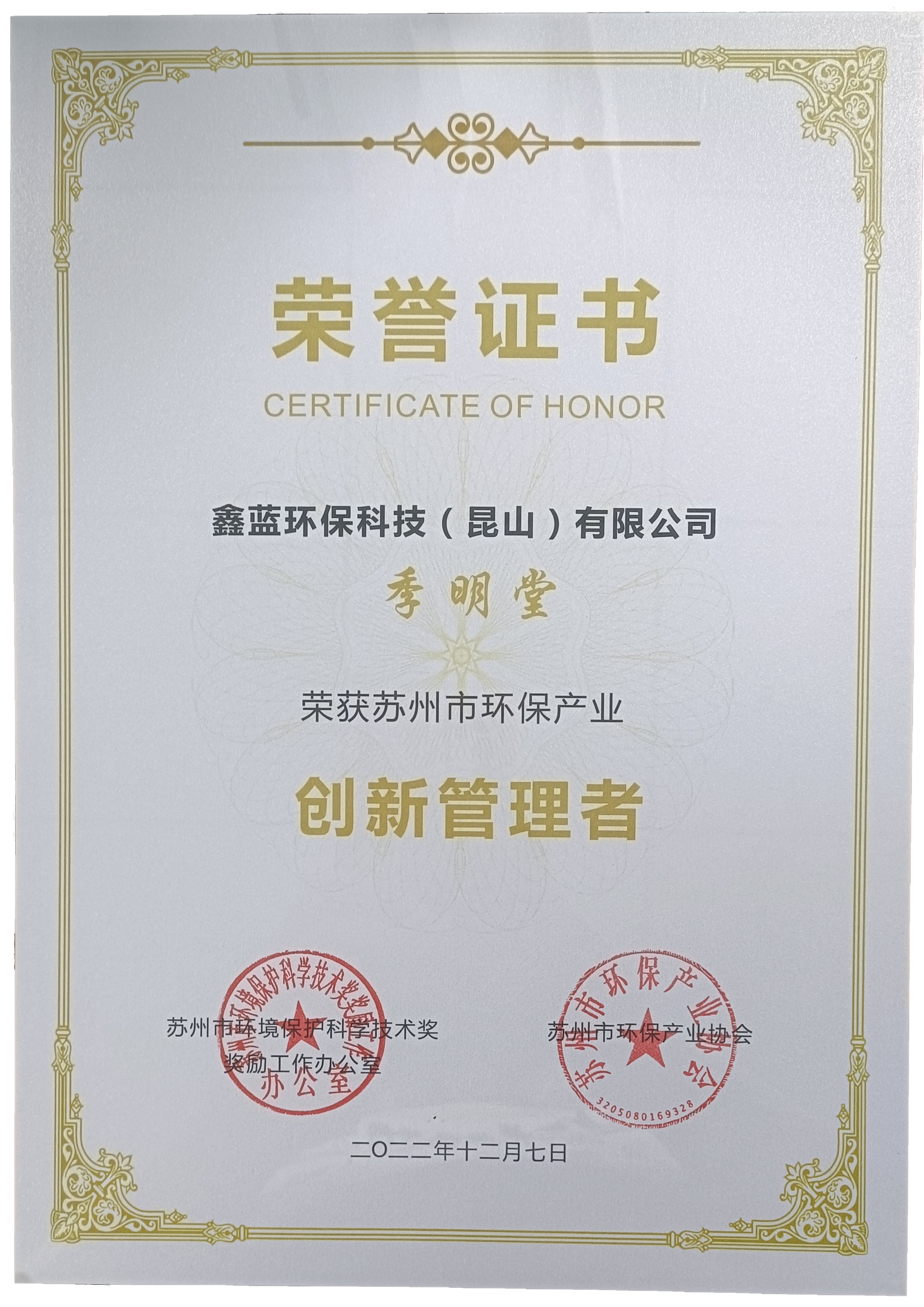近日,苏州市环保产业协会联合苏州市环境保护科学奖奖励工作办公室公示了一批创新管理者名单,乐竞lejing(中国)环保科技(昆山)有限公司董事长季明堂获得创新管理者称号。