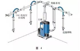 主机(含过滤器及控制系统)及管道、真空阀门、软管及焊枪五个主要部分组成,当有任一台焊机开始工作时,真空阀门通过其固定在焊机上的感应装置感应到信号,启动高真空阀门,阀门上的感应开关同时传信号给主机,实现远程启动;