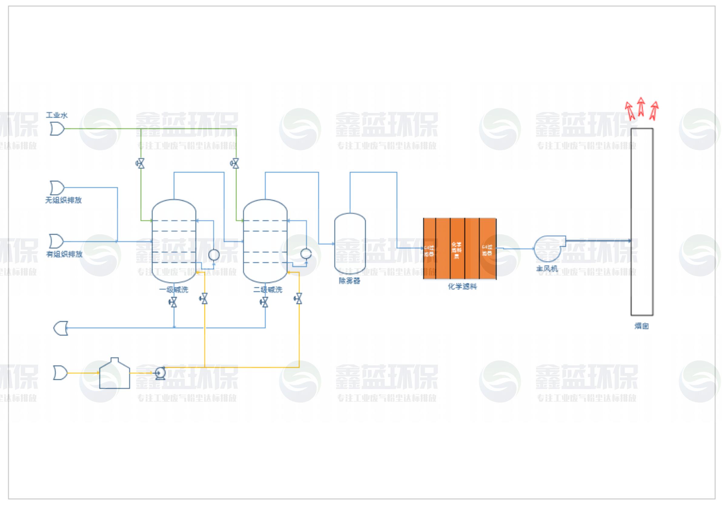 洗涤塔是应用广泛的湿式预乐竞入口设备,可以有效地去除废气中的颗粒物。在本案中可以采用填料喷淋塔作为预乐竞入口,喷淋塔内安装2层填料外加一层除雾层,循环水槽内存储1-2m3的循环水循环使用。