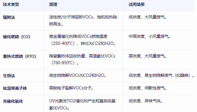 吸附浓缩+燃烧:活性炭吸附低浓度废气,脱附后高浓度气体进入RTO/CO,适用于大风量低浓度场景。
