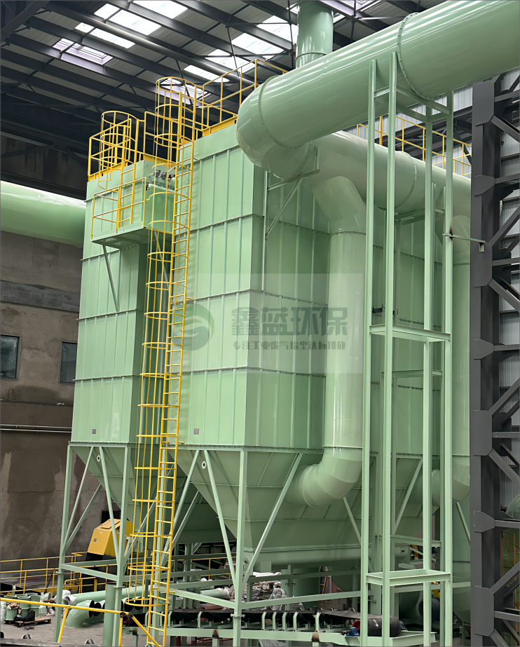 三、设备进风口装置流斜挡板,利用旋风导流和挡板阻挡作用下,大部分粉尘直接落入灰斗,减轻滤料的过滤压力和延长滤袋寿命,提升除尘速率。