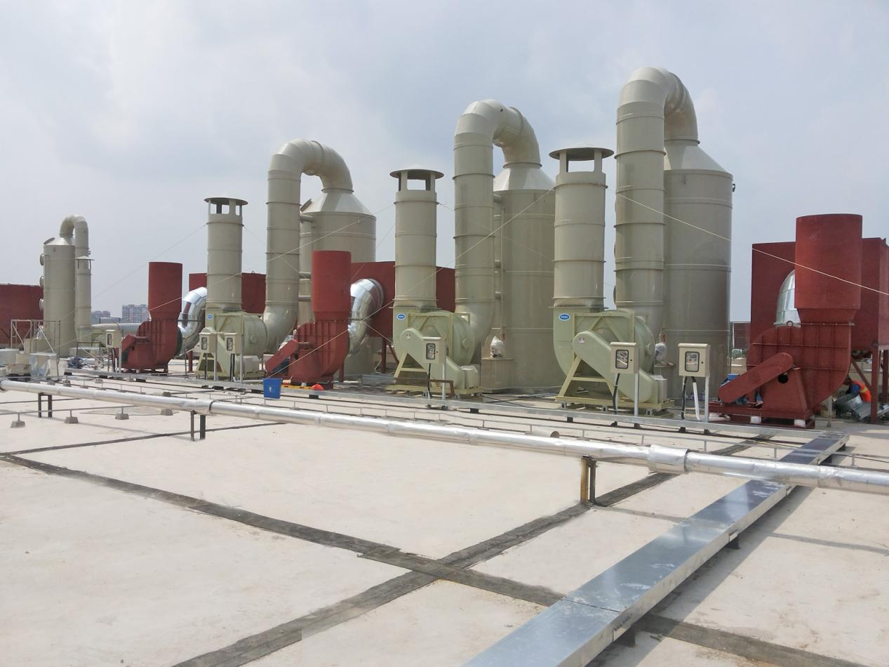 生产车间酸雾废气经风罩收集,经管道再进入碱液洗涤塔,碱液洗涤塔体放置二层填料层并配置二级水浴装置,并在循环水池内加氢氧化钠(简称碱),以中和废气中的酸雾,经二级喷淋塔装置清洗后完全能保证达标排放。