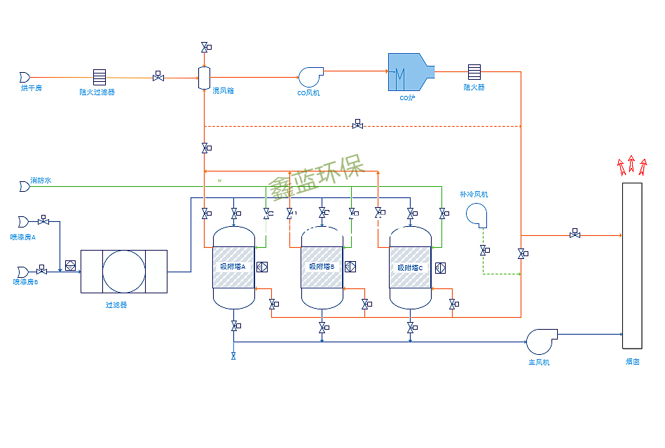 采用“吸附浓缩”+“催化氧化”复合技术,先对废气中的有机物进行浓缩,使低浓度大风量的废气转换为高浓度小风量的废气,浓缩之后的废气,在催化剂的作用下进行低温无焰热解,同时自身燃烧产生的热量可以满足燃烧温度,无需外部预热,催化燃烧生成二氧化碳和水。