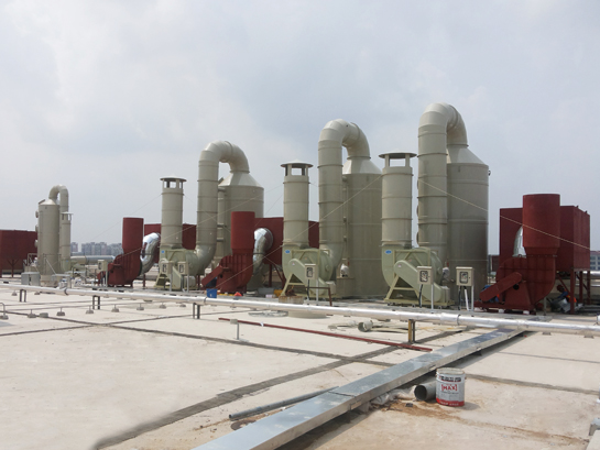 喷淋洗涤塔采用氢氧化钠(NaOH)溶液(或硫酸溶液)作为吸收液来净化酸性(或碱性)气体,酸性(或碱性气体)气体由离心通风机吸入进风段后向上方流动、而喷嘴喷出的中和液由上向下喷淋。从级中喷出的中和液与上升的酸性(或碱性气体)气体进行气液接触,吸收中和液往下湿淋级填料层,使从下往升的酸性(或碱性气体)气体得到气液接触吸收中和.中和液再向下淋级填料层。再一次获得气液相接触吸收中和作用;同时还增大了级中填料的湿淋量、从而加大了该填料层的气液比;正因为酸性(或碱性气体)气体是自下往上升。因此通过级填料层的酸性(或碱性气体)气体浓度高.这样使高浓度的酸性(或碱性)气体曲折地从填料间空隙通过向上升时,与向下流动的中和液接触吸收中和、可使酸性(或碱性)气体通过该填料层后浓度急剧下降,然后再经过一排中和液喷淋,酸性(或碱性)气体与吸收液中和后,浓度再度下降;然后再通过一个填料层和一排中和液喷淋的接触吸收中和、使酸性(或碱性)气体的浓度净化到设计的预定效果。后通过防雾层经帽盖而排入大气。